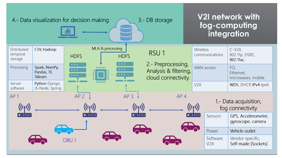 Several access points were distributed and connected through vendor-specific protocols to ensure communication between an OBU and an RSU. The OBU has three sensors and an external antenna device to acquire data from its surroundings and the data’s position. Then, through socket communications, it can send information to the RSU device. Thus, the RSU device handled both the server-side of the communication channel and the data preprocessing.