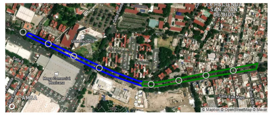 The team selected two routes within the same avenue, called “Prolongación Canal de Miramontes”, in Mexico City. The total distance for the first route consisted of more than 1.1 km, while the second route was about 1 km long. The satellite view of both routes can be seen in Figure 4.