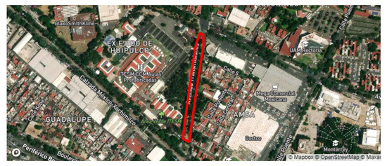The street used as a reference had very few anomalies, was recently paved, and was mostly flat in all its extensions. “Transmisiones” street is located in front of a section of the Tecnologico de Monterrey—Mexico City campus. Therefore, it was a suitable candidate because it contained the aforementioned characteristics, and its proximity to the campus is a great advantage. In this whole street, we found three uneven drains, several speed bumps, and one steep curve; therefore, these were the labeled anomalies and were used as a reference in the training and classification of the visualization system. The Figure 5 shows a satellite view of the street.