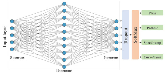 The ANN was built using the TensorFlow library for Python. It is a sequential model with four hidden layers, and three dense hidden layers with five, ten, and five neurons, respectively. A dropout layer is used to reduce overfitting and improve the generalization of the network, and a Softmax layer is used to generate the four outputs. All fully connected layers used the Rectified Linear Unit (ReLU) activation function. The Figure 6 shows the full architecture of the neural network.
