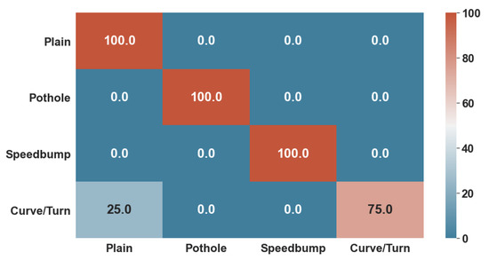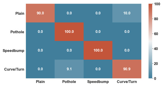 During the data acquisition process, the vehicle did not experience unevenness with great height differences, nor did it pass through tunnels, bridges, traffic lights, or other typical situations for a city road. Thus, this limited its ability to differentiate common cases of healthy streets and anomalies such as bumps, potholes, or any other type. Therefore, it is necessary to include all kinds of daily situations that do not represent a problem for the road in the training.
