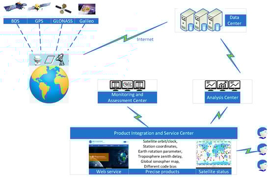 The ISC is the center of iGMAS products reprocessing, which evaluates the quality of GNSS products submitted by individual analysis centers, and then reprocesses them to generate the combined products and the corresponding accuracy indexes. The products are delivered to users through the portal website of http://www.igmas.org (accessed on 30 December 2021 for Chinese version), which is supported by monitoring stations, data centers, and analysis centers.