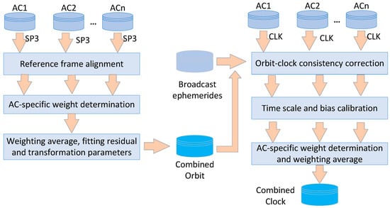 Figure 2 presents the flowchart of multi-GNSS orbit and clock combination of iGMAS. Since both the ACs’ orbits and the combined solutions are used for consistency correction in the procedure of clock combination, the multi-GNSS orbits are firstly combined, then it is the clock combination’s turn. Apart from the orbit and clock products used as input data, the earth orientation parameters and multi-GNSS broadcast ephemerides are also utilized in the combination procedure.