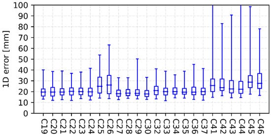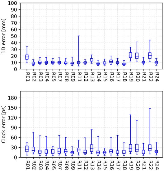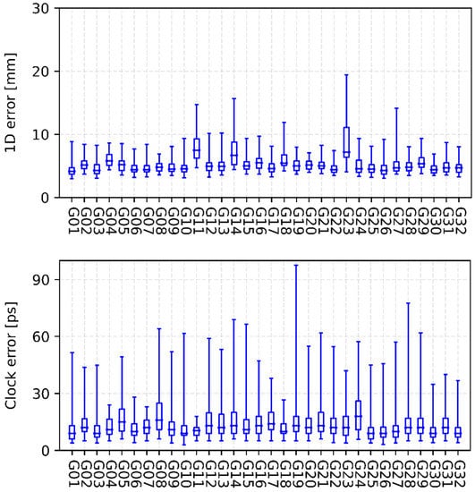 Figure 7 and Figure 8 show the consistency between iGMAS and IGS final combined GPS orbits and clocks, respectively. The 1D errors of all GPS satellite orbits are basically between 0.6 and 3.0 cm, which are better than 2.0 cm for most satellites. Moreover, the median RMSs of all GPS satellite orbits are relatively stable, with an average value of 1.5 cm. As shown in Figure 7, the standard deviations of clocks mostly show an agreement of 20–90 ps among all GPS satellites, and the median value is 62 ps. In terms of GLONASS, the 1D errors of most satellite orbits are better than 6.0 cm with a median RMS of 4.5 cm (Figure 9).