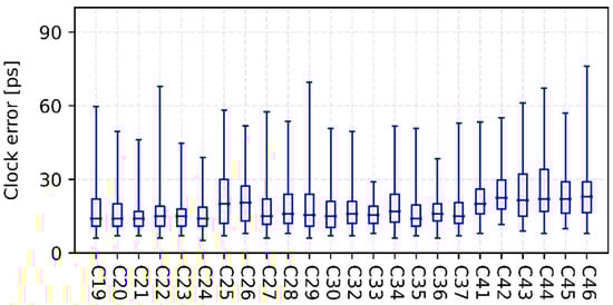 Figure 3, Figure 4, Figure 5 and Figure 6 show the internal precision of iGMAS combined GPS, GLONASS, BDS, and Galileo orbits and clocks (for convenient comparison, BDS only gives the results of BDS-3 MEO satellites), respectively. Among the quad constellations, GPS shows the best agreement with respect to combined solutions with an averaged 1D error of 6 mm. It is followed by GLONASS and Galileo, which are at the level of 10–15 mm. The agreement of BDS-3 is the worst at the 20 mm level. In fact, BDS-3 PRN C41-C46 have poorer internal precision due to the relatively small number of global tracking stations. Moreover, the clock errors of GPS, GLONASS, BDS-3, and Galileo are 11, 18, 20, and 15 ps, respectively. Whether for combined orbit or clock, an obvious heavy-tail distribution phenomenon exists in the internal precision, indicating that there are large differences between different AC products. It is worth mentioning that the influence of low-precision products can be partially suppressed by reducing the weight.