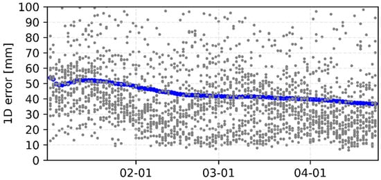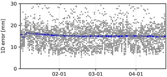 Consistency between iGMAS and IGS final combined GPS orbits. The gray circles indicate each GPS satellite for individual days and the blue circles represent the median RMS of all satellites.