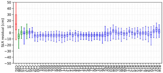 As a key feature, all GLONASS, Galileo and BDS satellites are equipped with laser ranging reflector arrays, enabling high-precision two-way ranging measurements. Thus, satellite laser ranging (SLR) observations collected by the International Laser Ranging Service (ILRS) can be used as an independent validation of iGMAS satellite orbits. Figure 10 shows the quantiles of the SLR residuals for iGMAS final orbits. Table 1 summarizes the mean biases as well as the standard deviations of SLR residuals for iGMAS final orbits. For BDS-2 satellites, the standard deviations are between 4 and 6 cm for MEO and IGSO satellites. However, the SLR residuals show a bias of about 13 cm with a standard deviation of 17.5 cm for C01, which is a GEO satellite. For BDS-3, the orbits of CAST satellites (e.g., C20 and C21) have a bias of 1.2 cm, whereas the orbits of SECM satellites (e.g., C29 and C30) have a bias of −4.7 cm. Moreover, the dispersion degree of SLR residuals for BDS-3 orbits is only 3.5 cm, which is smaller than that of BDS-2. The SLR residuals of Galileo satellites generally have a negative sign of 4.0 cm, which can be explained by the insufficient solar radiation pressure (SRP) modeling, the neglection of the Earth albedo as well as the ignoring of antenna thrust of the Galileo satellites. At the same time, standard deviations of SLR residuals for Galileo and BDS-3 orbits are on a similar level of 3.3 cm. For GLONASS orbits, there is no consistent sign in the bias of SLR residuals, and a standard deviation of 4.2 cm is achieved.