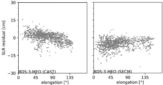 SLR residuals of BDS satellites manufactured by CAST (left panel) and SECM (right panel) as a function of satellite elongation angle for.