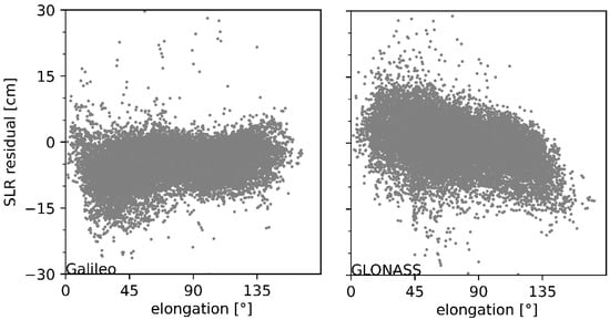SLR residuals of Galileo (left panel) and GLONASS (right panel) orbits as a function of satellite elongation angle.