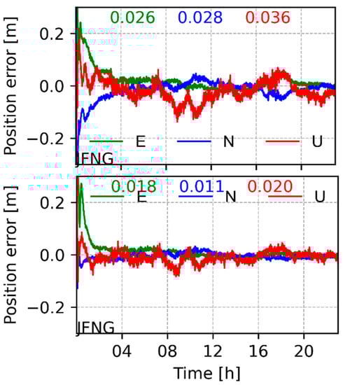 Positioning error of station JFNG in kinematic mode for GPS (top panel) and GPS/GLONASS/BDS/Galileo integrated (bottom panel) PPP.