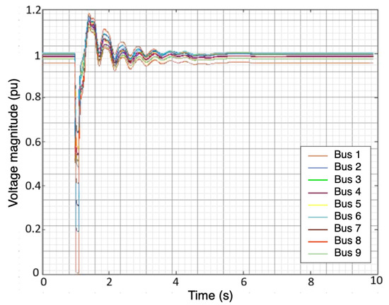 Voltage magnitude of the 9 buses after injecting three—phase fault.