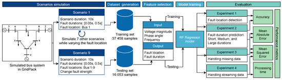 This paper is organized into the following sections: Section 2 focuses on RFR model description, with details on simulated fault scenarios, feature selections, and training/testing process; Section 3 discusses the analysis of four experiment scenarios for classifying and predicting fault location and duration with off-line/streaming conditions; and Section 4 draws conclusions and recommendations for future work.