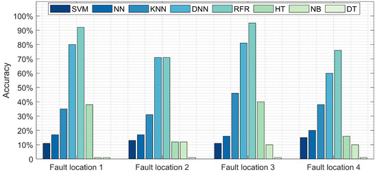 Comparison between the proposed model (RFR) and NN, DNN, SVM, NB, DT, and HT in terms of fault location detection accuracy at various location.