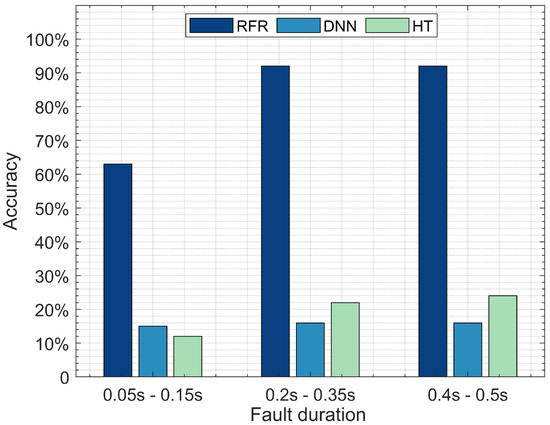 Accuracy of RF, DNN, and HT in terms of detecting fault location with various duration.