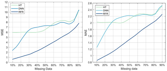 MSE and MAE as a function of the percentage of missing data for the three models: DNN, HT, and RFR.