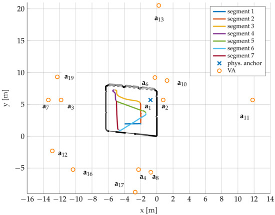For the experiment, the exact positions of the mobile agent and the VAs were unknown. Thus, in a pre-processing step, we used the SLAM algorithm [38,45] and CIRs from the measurement to estimate the trajectory positions and the locations of the VAs and PAs [43].