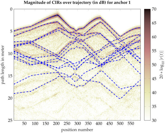 Measured CIRs over the trajectory at a bandwidth of 2 GHz. The blue dash lines indicate expected paths of the SMCs corresponding to VAs up to order two, estimated using the SLAM algorithm from [38,45] and refined as described in [46]. The locations of VAs are shown in Figure 1.
