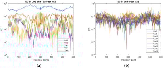 Figure 5 also plots the number of visible VAs at each trajectory point. For first-order and especially second-order SMCs, the accumulated EC correlates with the number of visible VAs, as shown in Figure 5a,b. It could be because for second-order VAs, the energy are relatively the same, as shown in Figure 4b. For first-order VAs, the energies for different VAs are quite different.