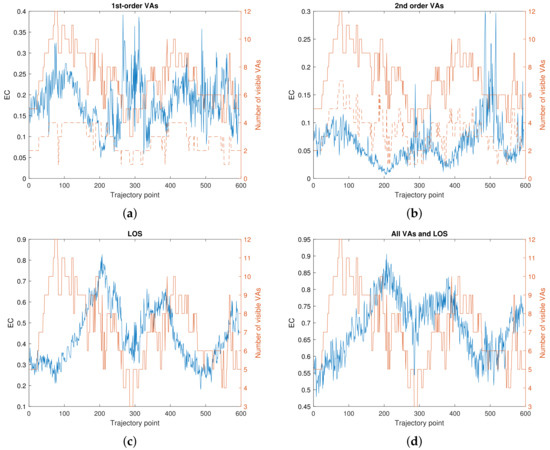 EC of certain SMCs vs. number of VAs visible: (a) first-order VAs only, (b) second-order VAs only, (c) LOS (PA) only, (d) all VAs and LOS (PA). The brown solid line shows the number of VAs that are visible from the corresponding trajectory point. The dashed brown line shows the number of visible VAs that are within the set of (a) first-order VAs or (b) second-order VAs.