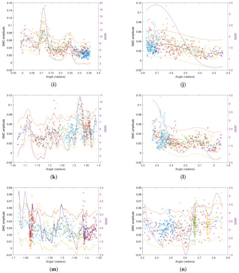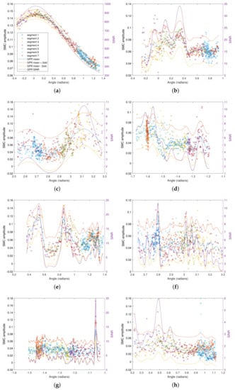 In this paper, the dataset is used, which deals with only the SMC amplitude’s abscissa. According to [43], the hyper-parameters of the GPM are , in which is the coherence angle, is the standard deviation of the correlation kernel, is the standard deviation accounting for the DM, and is the mean of the abscissa of the k-th SMC amplitude.