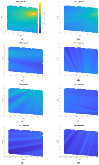 Implementing GPR on measurement data allows us to predict the SINR as well as the amplitude of the SMCs for each point in an environment at which an SMC is visible. Figure 7 shows this prediction result in terms of the , while Figure 8 shows the predicted mean amplitude . It is evident that the LOS path has very high SINR compared to other SMCs, thus it yields very high range information. However, in the case that the LOS is not available, choosing a good NLOS SMC is necessary. Two parameters could be used to choose between SMCs, the SINR and the SMC amplitude. The SINR is an appropriate measure to describe the ranging information provided by some SMC, which is an important metric for (multipath-assisted) positioning algorithms (see Section 5), while the amplitude translates to communication-performance metrics like channel capacity [53] and bit error rate.