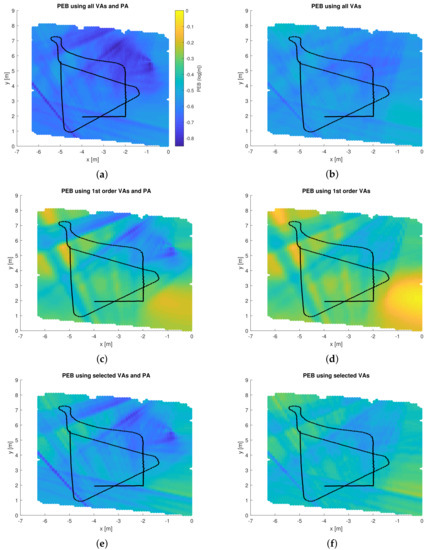GPR-predicted PEB considering information from SMCs corresponding to: (a) all VAs and the PA, (b) all 1st and 2nd-order VAs, (c) 1st-order VAs and the PA, (d) all 1st-order VAs, (e) selected VAs and the LOS, (f) selected VAs.