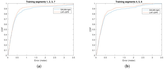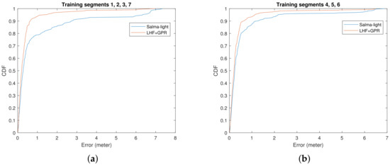 CDF of the localization error using (a) training segments 1, 2, 3, 7, (b) training segments 4, 5, 6. The blue solid line plots the error CDF obtained when SALMA-light is used. The orange solid line plots the error CDF obtained when optimizing the LLHF with prior knowledge from GPR. The phase is approximated by using the phase from CIR. Overlap checking is performed first before implementing the algorithms.