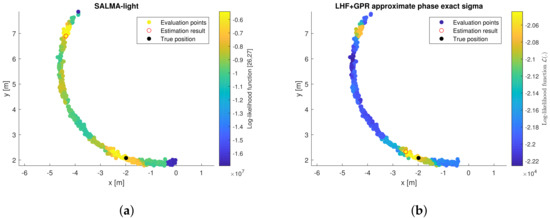LLHF values obtained using (a) SALMA-light, (b) LHF+GPR with exact sigma. LLHF values at evaluation points are plotted with color code. The red circle denotes the estimation result, while the filled black circle denotes the true position.