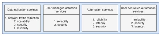 The second two categories include more complex services that include all previously stated operational components. Automation services include completely autonomous scenarios, where actuation is executed autonomously based on the sensor data collected from the targeted environment (e.g., autonomous driving, automated parking ramps, etc.). Primary QoS parameters within such scenarios are reliability and latency, since actions must be completed almost instantly as a response to real-world situations. User-controlled automation services are a similar category where the actuation is to a certain extent controlled by the user (e.g., smart intercom, camera drones, etc.). Hence, latency in such scenarios is a less critical QoS parameter than reliability and security, since the threat of unauthorized actuation control exists within this category.