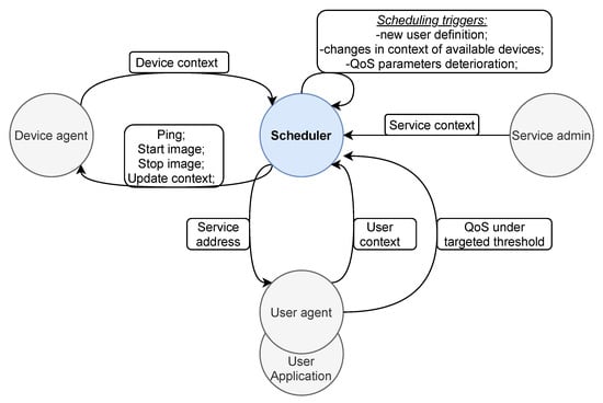 User agent component runs on the user’s end-device along with the user application, and it also interacts with the Scheduler. Its purpose is to send the initial request containing user context information to the Scheduler, upon which it executes the scheduling procedure and returns a response containing the address of the targeted service component. Thus, the user application communicates directly with the requested service running on the fog node with the specified address. Additionally, if targeted user-specific limitations on QoS parameters are not satisfied, the User agent notifies the Scheduler with the request to execute a re-scheduling procedure.