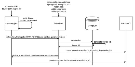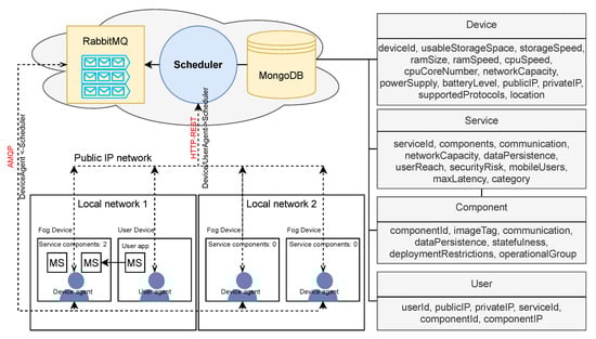 The technical architecture of our scheduling environment is depicted in Figure 4. The Scheduler component has a public IP address and it is reachable to all other system components (Device agent and User agent) through its publicly exposed REST API. At startup, the Scheduler receives the input parameters that specify RabbitMQ and MongoDB connection details. All received context information of involved entities is stored within the MongoDB database, utilizing the data model depicted in Figure 4. The Scheduler utilizes the communication over the RabbitMQ message-broker to communicate with Device agents that are usually not reachable through the public network. Thus, the Scheduler creates a message queue within the broker for each registered device upon receiving its registration request. As a response to the registration request, the Device agent receives the parameters necessary to establish the connection with the RabbitMQ message-broker and the generated device_id. This device_id is also the name of the queue where the Scheduler sends commands for this specific Device agent, and thus, the local nodes are available to the Scheduler as they are subscribed through long-lasting connections to their corresponding queues within the RabbitMQ broker (Figure 3). It is also important to emphasize that we implemented synchronous communication through the RabbitMQ message broker to confirm the successful command execution and recognize if a particular fog node has become unavailable. The User agent also communicates with the Scheduler using the HTTP protocol, and the final communication between the user application and the requested service is direct once the service has been deployed to the selected fog node, as depicted in the lower left corner of the Figure 4.