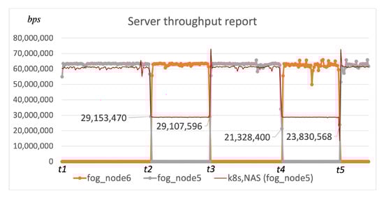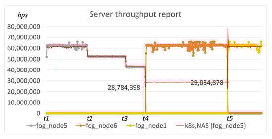 Figure 6 shows the throughput reported from the data reception component, and each thick-colored line represents a different fog node where this component was running. It can be seen that the re-scheduling was triggered instantly when the throughput value was under the pre-defined limit and that the service was then migrated to the more suitable fog node based on the ping value at the given moment. Kube-scheduler runs the scheduling procedure only when the application is not deployed, and it does not support the re-scheduling execution based on the fluctuating network QoS parameters. Since both custom Scheduler components are based on the Kubernetes platform, they had the same performance in this simulation scenario visualized with the thin red line in Figure 6. It can be seen that the re-scheduling procedure does not occur when the throughput decreases. Thus, it remains low, although another available fog node could satisfy the targeted QoS requirement.