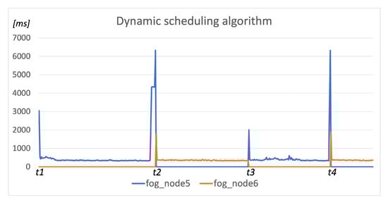 Figure 8 presents the results of our automation scenario test execution utilizing the presented dynamic scheduling algorithm to deploy service components. The User agent and the user’s application were started on the fog_node3, and the first scheduling procedure executed at t1 placed all components on the fog_node5 since it had lower ping-response latency than the fog_node6. The response latency was under the defined threshold until we increased the latency on link2 to cause exceeding the pre-defined latency limit at t2. This initiated the re-scheduling procedure that migrated components to the fog_node6. The response latency was then again under the defined threshold until t3, when we terminated the execution of fog_node6 and caused the request timeout. The re-scheduling procedure was executed again and the components migrated to the fog_node5 (latency on link2 was reset between t2 and t3), where they were running until t4 when the latency limit was exceeded again. Between t3 and t4, we started the execution of fog_node6 again, and thus, after the re-scheduling procedure at t4, the components migrated back to the fog_node6.