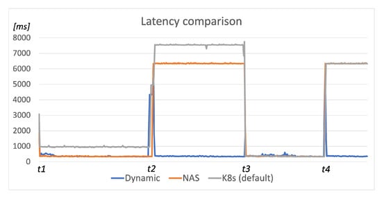 The automation simulation was repeated with custom Scheduler components utilizing the described scheduling policies to confirm the expected behavior, and the results are shown in Figure 9 along with the results of our dynamic scheduling policy. NAS has the same performance between t1 and t2 as our dynamic scheduling algorithm since it deploys all components of the service together on the node with the shortest RTT (fog_node5). The Kubernetes scheduler has deployed one component on the fog_node6 and two components on the fog_node5, and because of their mutual communication through the link3, the latency is higher, which also confirms its less efficient performance in comparison to the NAS algorithm as described in []. At t2, the latency between the user and the fog_node5 is increased, and our dynamic scheduling algorithm runs the re-scheduling procedure. However, since nodes are still running and the deployed application is available, the Kubernetes platform does not run the scheduling procedure as it does not recognize the latency deterioration. At t3, the fog_node6 is terminated and the latency on the fog_node5 is reset. Our scheduling algorithm migrates the application components due to the response timeout to the fog_node5, but the Kubernetes also recognizes the outage of the node where the pod was running. Thus, it also migrates the third component that was deployed on the fog_node6 to the fog_node5. All three approaches have the same performance between t3 and t4, until we increased the latency again on the link towards the fog_node5 and caused the migration of application components to fog_node6 within our algorithm. The re-scheduling did not occur utilizing the other two approaches, so the components remained deployed on the fog_node5 that had the increased latency.