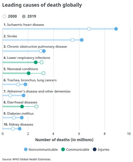 - World Health Organization. The Top 10 Causes of Death. Available online: Used under a Creative Commons Attribution-ShareAlike License: CC BY-NC-SA 3.0 IGO. Available online: https://www.who.int/news-room/fact-sheets/detail/the-top-10-causes-of-death (accessed on 24 September 2021).