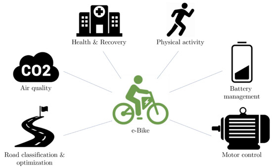 One side effect of using an electric bike is that, while reducing the carbon footprint, it causes the cyclist to breathe polluted air, and this is noticeable in big cities ([127,128,129,130]) Sweeney et al. [66] and Venkatanarayanan et al. [67] proposed interesting ideas to control the respiration rate and measure air quality, respectively. Both are used to reduce the inhalation of traffic pollution, which has proven to have a greater negative impact on cyclists than people using other methods of transportation [131]. This is especially important to consider when the rider has respiratory pathologies such as asthma or even lung cancer. Caggiani et al. [132] addressed this issue by proposing an algorithm that can optimize the route depending on the user’s desires (i.e., travel time, safety, air pollution). Implementing this on an electrically assisted bike could help to protect the cyclist even further when commuting or doing exercise, and at the same time, collect data which can be used by local authorities and environmental groups to manage the air quality in cities and their surroundings, as proposed in works by Elen et al. [133], Liu et al. [134], Aguiari et al. [135], and Shen et al. [136].