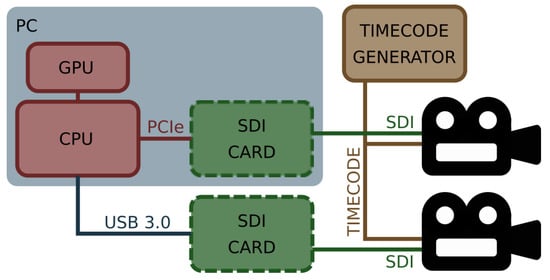 As already mentioned, the heart of the system is a computer equipped with a CPU and GPU accelerator. The film crew can select the form factor of the computer according to the needs and limitations of the film set. It can be a desktop computer, notebook, or industrial computer mounted in the rack together with other equipment. The selected computer needs to be extended with an image acquisition card(s) supporting SDI, which is a common standard used in the modern film industry. The system supports SDI input cards manufactured by Blackmagic Design company. This company offers a wide range of SDI-based solutions. Their extension cards provide from 1–8 SDI inputs and can communicate with the CPU using an Universal Serial Bus (USB) (solution preferred for notebooks) or Peripheral Component Interconnect Express (PCIe) interface (solution for desktop and industrial computers). The system can handle more than one card. Its final configuration depends on the user.