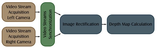 Determining a disparity map on a film set during the recording process allows the creators to analyse, evaluate, and if necessary, correct the quality of the 3D image. The generated disparity map should reflect the image observed by the camera as closely as possible, without distortions and clipping the image area. Therefore, the main objective of the work was to develop appropriate, efficient algorithms for image preparation (rectification) and determining a disparity map. Figure 2 presents the data flow diagram for the implemented diagnostic system. The raw data from the cameras are acquired by the two independent threads, synchronised using timecode metadata attached to each frame, and transferred to the data-processing thread that performs image rectification and disparity map calculation.