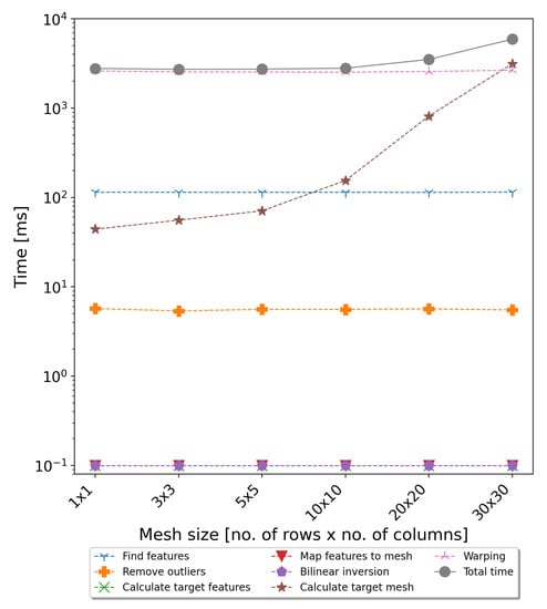 The evaluation of the execution time of the above steps showed that the most time-consuming parts of the algorithm are warping and (for dense mesh) calculating the target mesh coordinates. Detailed measurements of the execution time of all individual steps are presented in Figure 3. Taking into account that the warping is a pixelwise algorithm, it is ideal for GPGPU parallelisation.