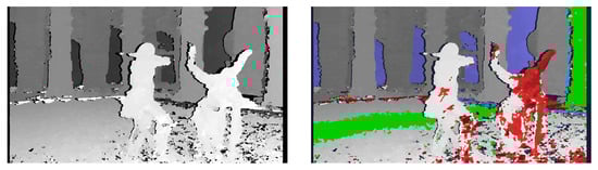 Thanks to the acceleration of the calculations using the GPU, it is possible to process a few image frames per second, assuming that the video preview distributed over the movie set is full HD resolution. A higher frame rate makes the disparity map video feel smoother and improves the quality of work with the system. Figure 4 and Figure 5 present example outputs of the disparity map generated by the described diagnostic system. Figure 4 presents the disparity map calculated for raw images acquired from the stereoscopic rig (without rectification). Figure 5 presents the disparity map for the same images, but after rectification performed with the algorithm described in Section 3.1. The comparison of both figures shows that even for stereoscopic rigs with low-angle convergence, the rectification of the input images significantly affects the quality of the generated disparity map. It is related to the optimisation of the depth map determination algorithms, which, to save computing time, assume practically zero vertical disparity. Detailed results from the evaluation of the system performance are presented in Section 5.