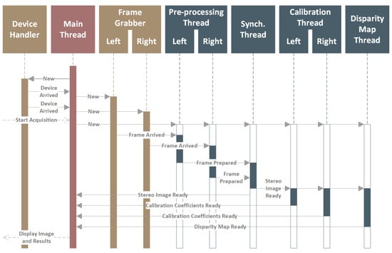 Figure 6 shows a simplified sequence diagram presenting all the algorithms executed by the software to acquire and synchronise two video streams, process images, and display all information to the user. As shown in the diagram, the software uses multiple independent threads for individual tasks to improve performance and achieve the maximum use of the processing power of the CPU. Communication between all the threads is based on signals and callback functions, reducing the latency and facilitating software development.