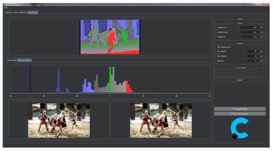 Electronic and IT tools for monitoring the quality, especially the disparity limits, can significantly facilitate the work of a film crew and enable quick and reliable detection of errors during 3D video recording. Exemplary systems supporting the recording crew were proposed in [7,8,9]. The Stereoscopic Analyzer (STAN) is an image-based assistance tool dedicated to 3D video shooting [8,9]. It supports the mechanical alignment of the stereoscopic cameras, allows correcting the distortions in the recorded image, and enables determining the current depth window. The depth budget analysis is performed based on selected feature points. A similar functionality is offered by the real-time stereoscopic analyser proposed in [7]. The analyser monitors the horizontal disparity distribution and generates warnings if the budget is exceeded.