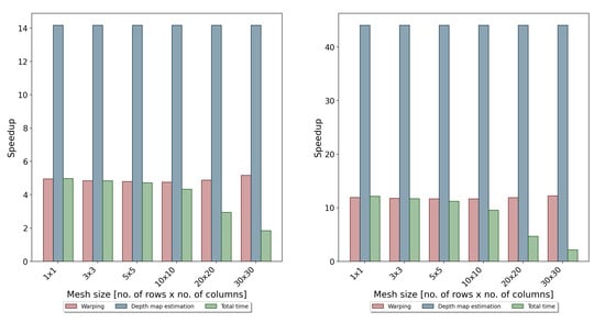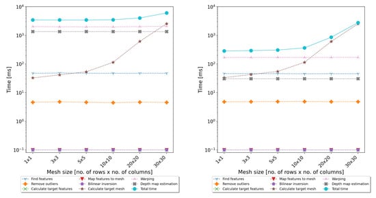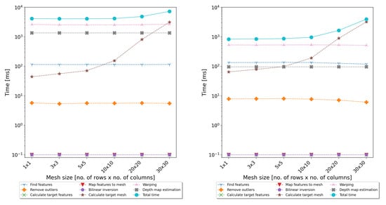 In the case of the notebook, the obtained acceleration was 4–5-times, and the average processing time required to calculate the disparity map was about 1 s per frame. In the case of the desktop computer with much better performance parameters, the speedup was about 10–12-times, and the total processing time was around 300 ms. As shown in Figure 8 and Figure 9, the last non-optimised part was the algorithm responsible for calculating the coordinates of the target mesh vertices. Its execution time is related to the mesh size, and for dense meshes, it can significantly slow down the whole algorithm. However, as can be seen from Table 1 and Table 2, the use of fine meshes did not bring significant advantages in terms of accuracy. For the tested mesh sizes, the 10 × 10 size seemed to compromise the accuracy and efficiency of the proposed algorithms. However, in the further development of the system, the authors considered also transferring this step to the GPU and using a dedicated sparse matrix solver.