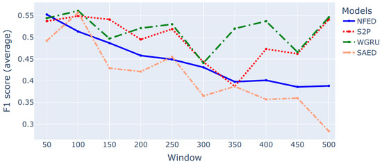 The second step is to adjust the parameters of the environment for each model separately. The most important parameter is the size of the input sequence. The best window length for each model is decided via a series of experiments that use the 5 cross validation technique for each target appliance. The final configuration of window length per appliance for each model is presented in Table 2. A representative example of this type of experiments is depicted in Figure 1. The score is the average score of the 5 cross validation iterations. As shown in the figure, the lightweight models SAED and NFED perform better with small windows for the case of a washing machine. The larger models S2P and WGRU show a decline in performance while the window size is increased and then after window length 350 the performance increases again. The maximum window that is tried is 500 samples, which corresponds to 50 min.