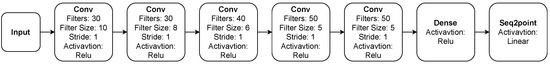 Sequence-to-point (S2P) is a convolutional neural network proposed by Zhang et al. [10]. The original architecture of the network accepts as input a sequence with size 599. It consists of five convolution layers with the non-linear activation function ReLU. The final layer is the output of a linear activation function. The details of the layers are depicted in Figure 2.