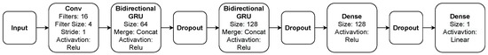 Window GRU (WGRU) is introduced by Krystalakos et al. [9] and its main component is the recurrent layer GRU [38]. The first layer is a convolutional one, followed by two bidirectional GRU layers and one dense layer before the output. In order to prevent over-fitting, the dropout technique [39] is used between layers. The input is a look back sliding window. Figure 3 shows the details of the architecture.