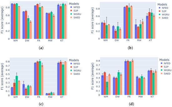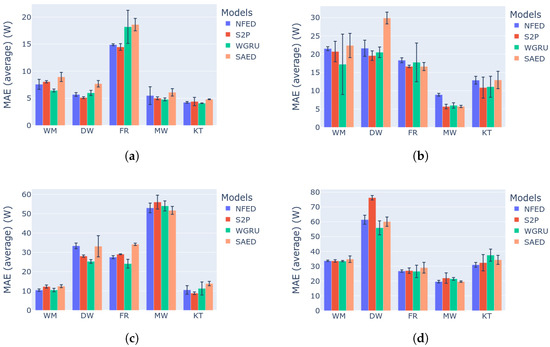 Benchmark categories 1–2 results for the models NFED, S2P, WGRU and SAED: (a) category 1: MAE results; (b) category 2: MAE results. Benchmark categories 3–4 results for the models NFED, S2P, WGRU and SAED: (c) category 3: MAE results; (d) category 4: MAE results.