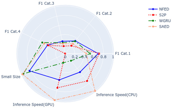 A fair way to compare different NILM models is to consider all the experimental results of the benchmark and the properties of the models. Figure 9 is a representative example for dish washer. It includes the score for the four categories of the benchmark and the following properties of the models: their size, the inference speed on a GPU and the inference speed on a CPU. All the attributes have their best values on the outer space of the disk. The closer to the centre the worse the result. As it is observed, NFED achieves top performance for all four categories and thus it is a good candidate to be deployed in the real world. Looking at the rest of the properties, NFED is the third fastest model. S2P would be a good candidate it speed is critical without sacrificing much performance. On the other hand, S2P has the largest size by far, which would make it prohibitive if there are strict constraints regarding storage space. All five appliances that are used in this paper are analyzed in the same way in Appendix B. To conclude, each model has each advantages and disadvantages and can be a good fit depending on the significance of the parameters and the requirements of the overall system.
