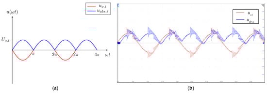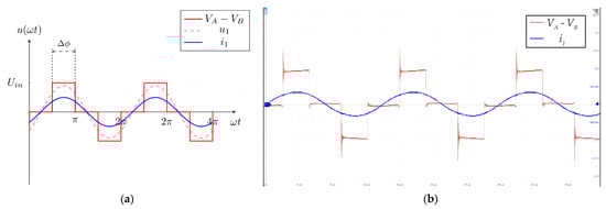 The current and voltage at the input of the resonant IPT circuit are presented in Figure 2a,b. Figure 2a presents the theoretical waveforms. Each leg of the full-bridge inverter generated a square voltage with a 50% duty cycle. To control the resonator current i1, a phase shift was introduced between the half-bridge legs. The phase shift angle could be between 0 and π. In the figure, input voltage VA − VB is marked with a red line, while the main harmonic component that drives the current through the circuit is marked with the dashed red line u1. The resonant circuit served as a bandpass filter. The current through the resonant circuit i1 is marked with the blue line. Figure 2b presents the waveforms, measured on a real system. The red line represents the voltage at the input of the resonant circuit, and the blue line represents the sinusoidal current at the input of the resonant circuit.