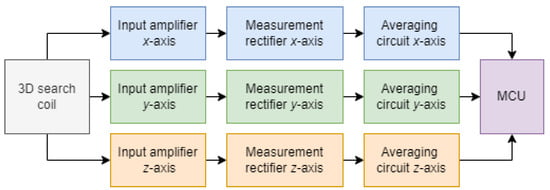 If the 3D search coil was placed in the varying magnetic field, the voltage was induced across the terminals. This voltage was then measured and converted to a digital value with the analogue–digital converter of the microprocessor. The induced voltage was sinusoidal, due to sinusoidal magnetic flux density. The measurement circuit converted the open circuit AC voltage into a DC voltage, which was then sampled using an AD converter. The value of the DC voltage was then used to calculate the amplitude of the input voltage, and, later, the magnetic flux density, based on the coil’s parameters. Each of the three single-axis search coils required its own measurement circuit. A block scheme of the measurement system is presented in Figure 4.